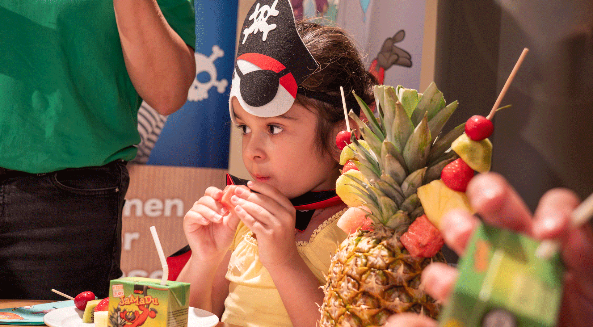 Per ricaricare le energie, serviamo una deliziosa torta e spiedini di frutta. Inoltre, con ogni festa prenotata, ogni famiglia riceve un regalo speciale dai nostri partner. Pronti a salpare per un’indimenticabile avventura piratesca!